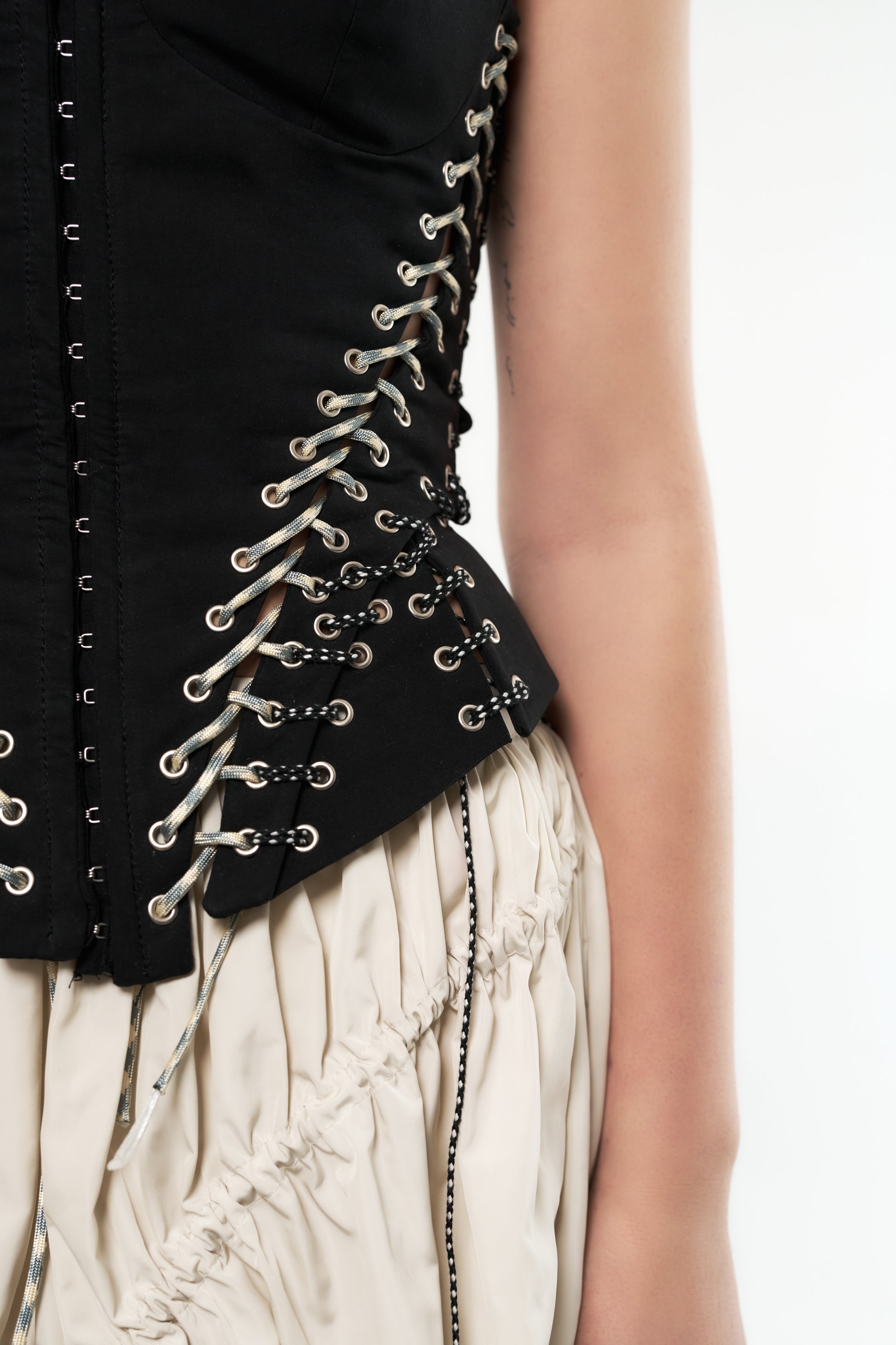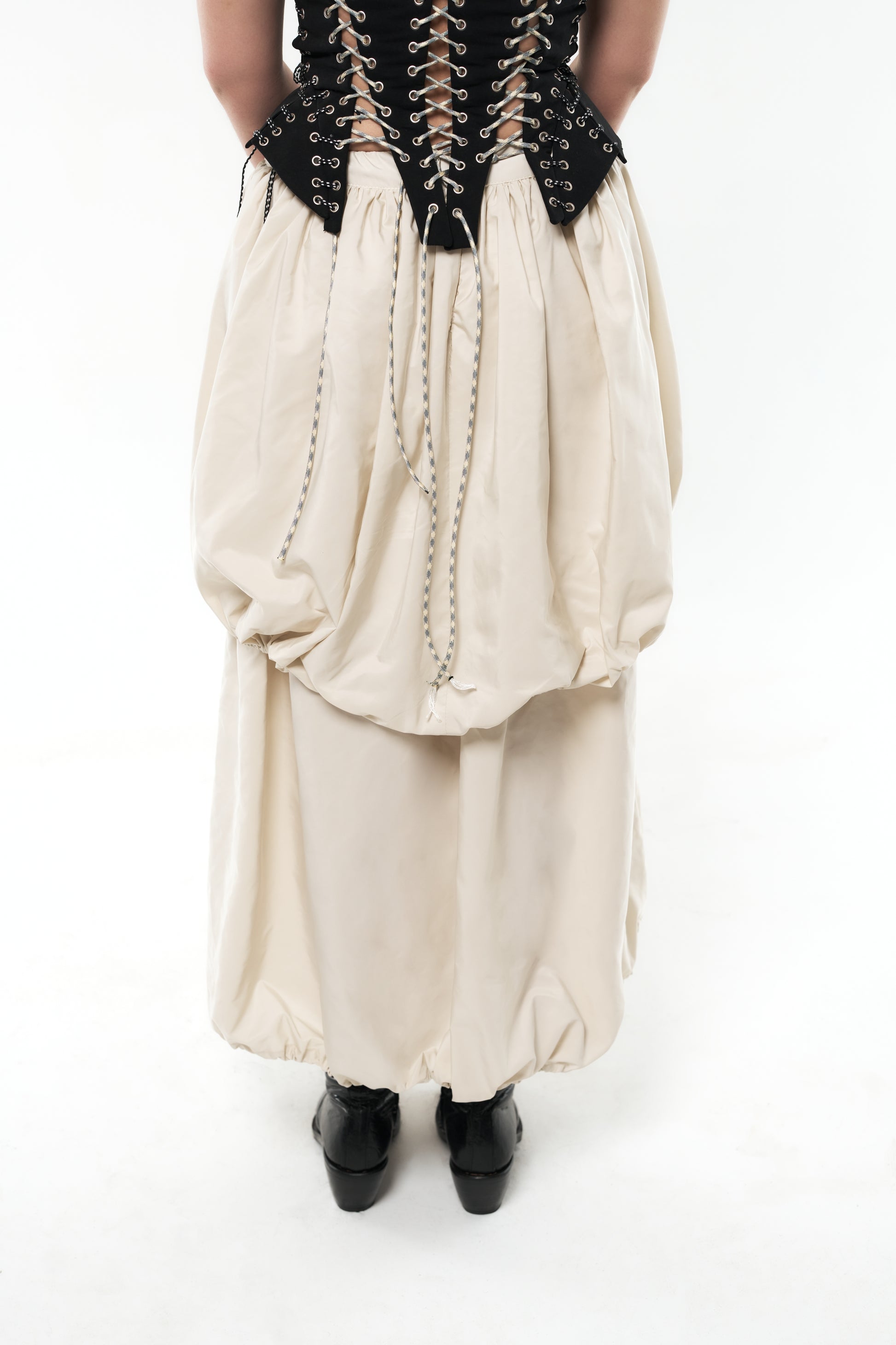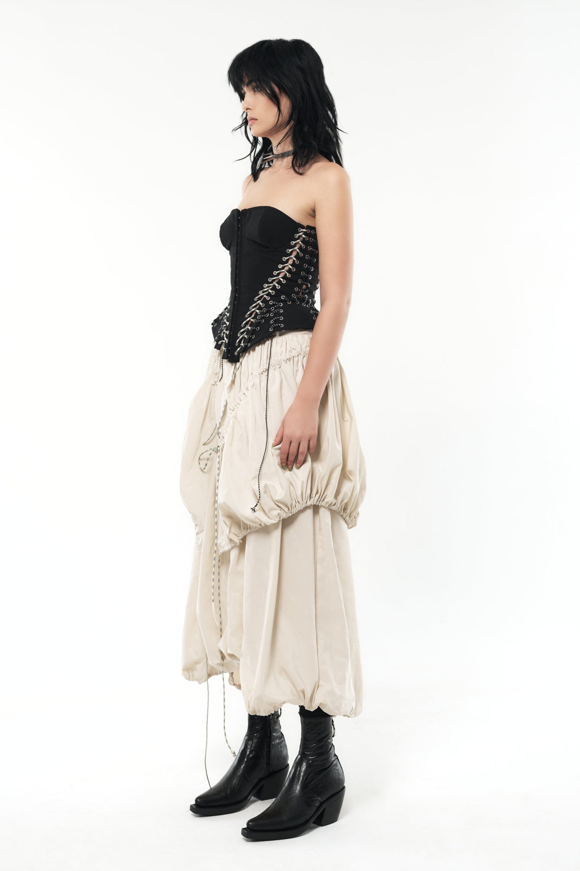 Standing out with its modern design and lively details, the two-layered gathered parachute skirt offers the wearer a customizable area thanks to its asymmetrical cut and laces.