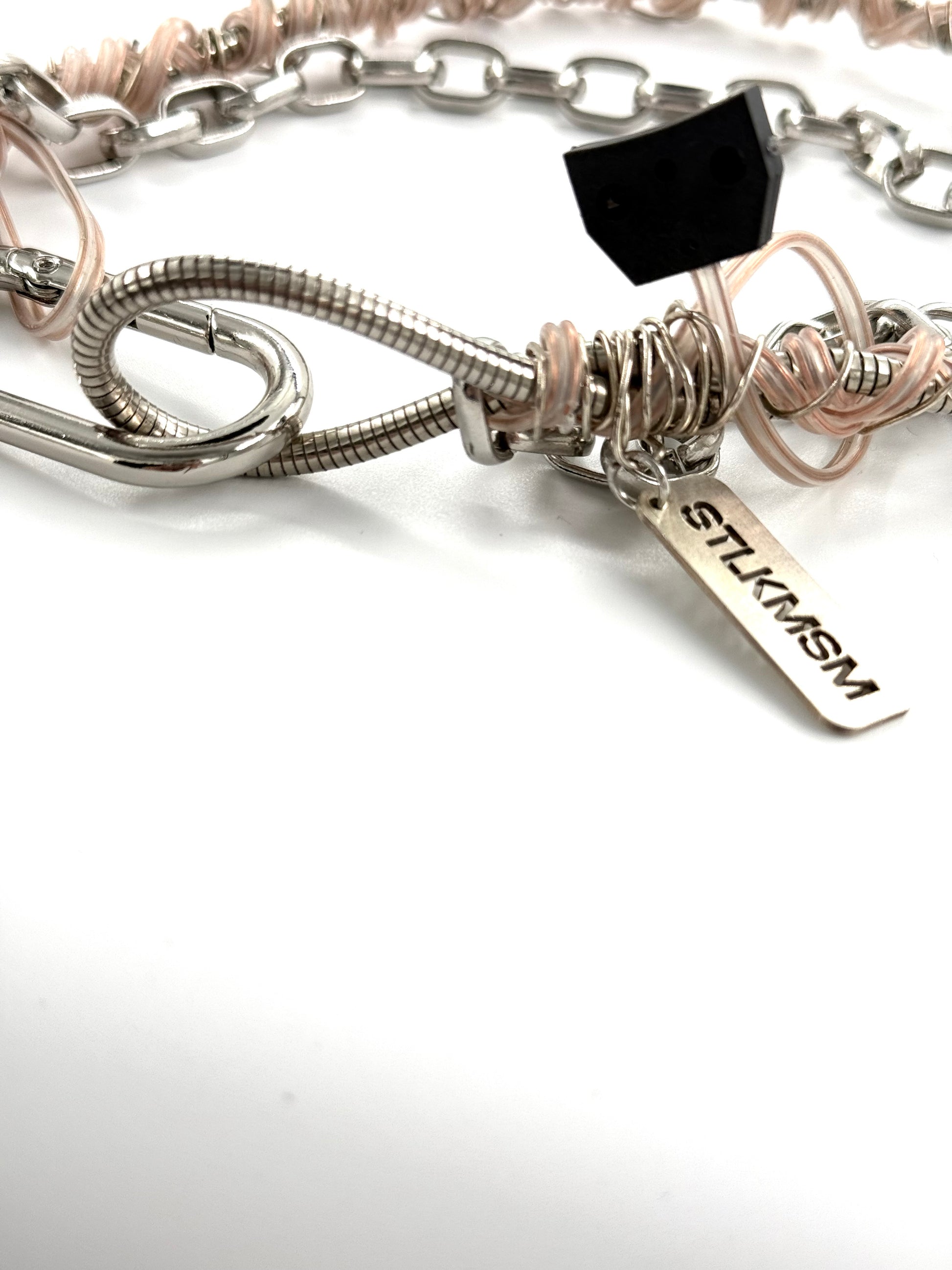 What once transferred data now transfers attitude. Hand-wrapped pink cable coils contrast cold metal links, carabiner closures, and a dangling connector detail.