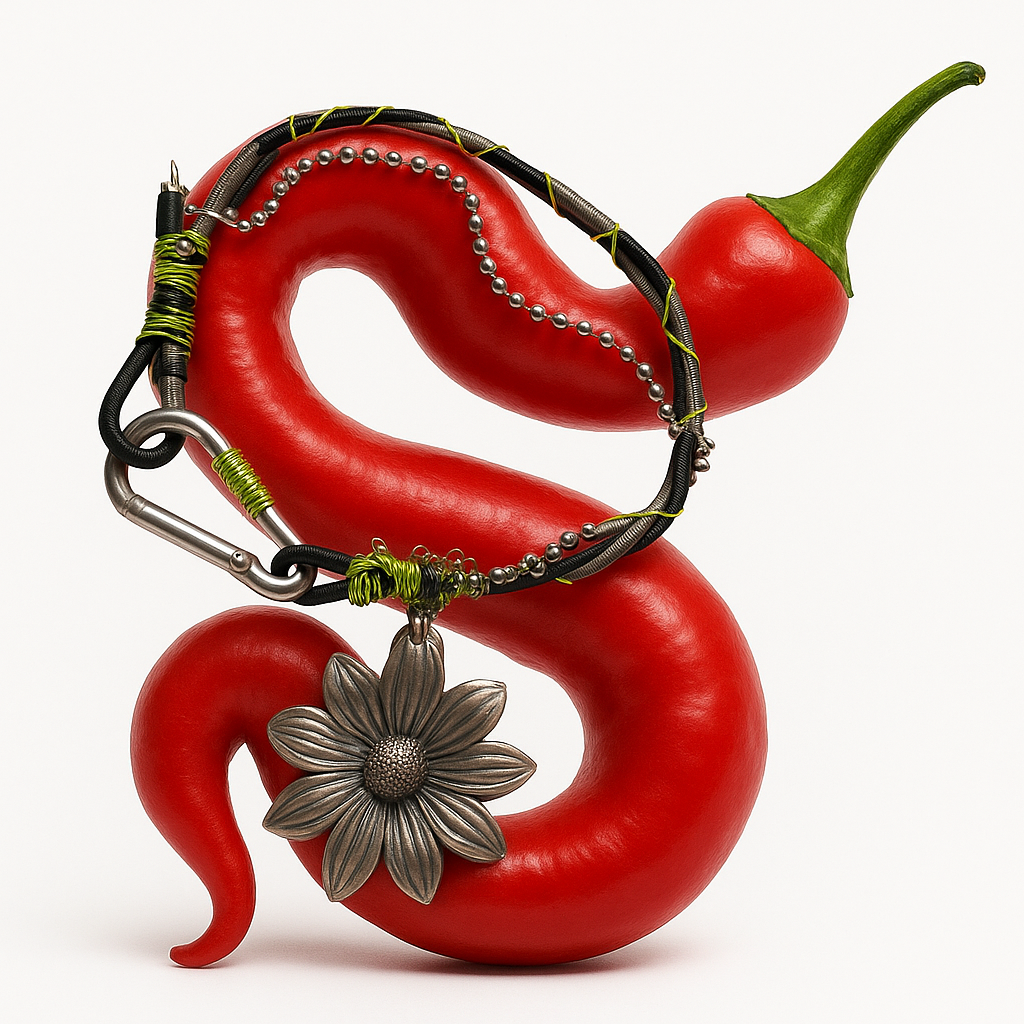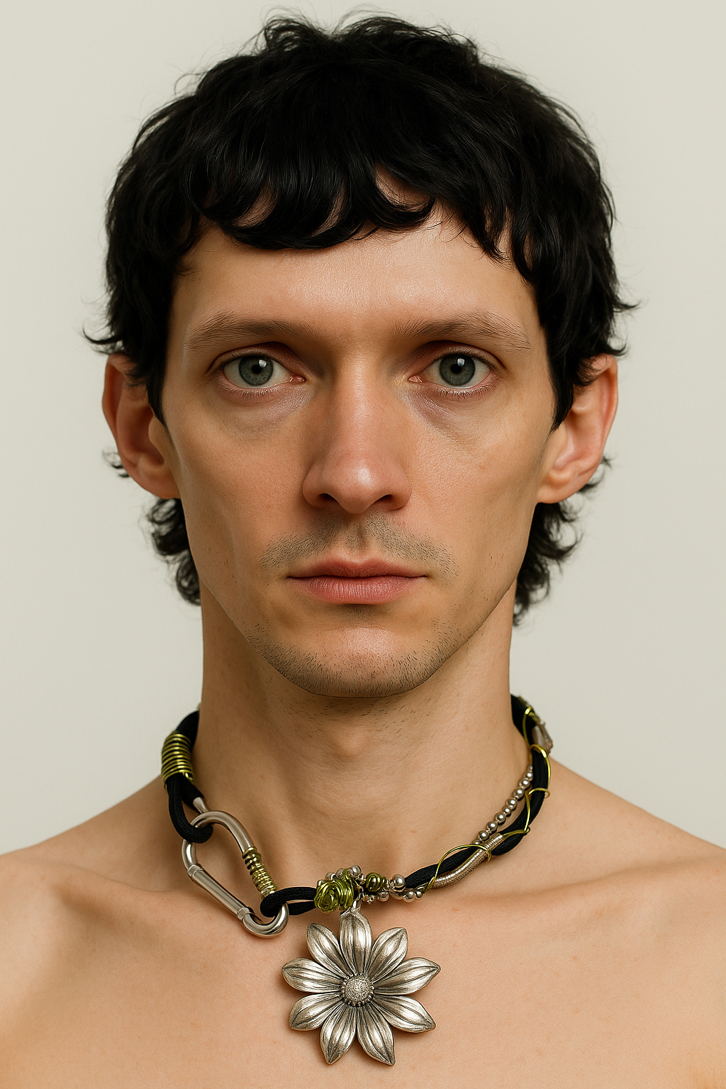 Steel Bloom is a lightweight yet durable necklace crafted entirely from upcycled industrial materials. Featuring neon-coated wire, stainless steel ball chain, and usb cables, it centers around a vintage metal flower—laser-cut and reimagined as a bold statement piece. The result is a design that merges raw function with delicate form, blending sustainability with striking aesthetics.